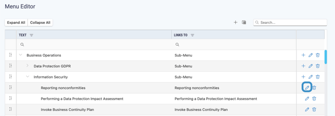 - To change a menu item's name click on the edit icon next to the menu item, an editing box will appear below the item.